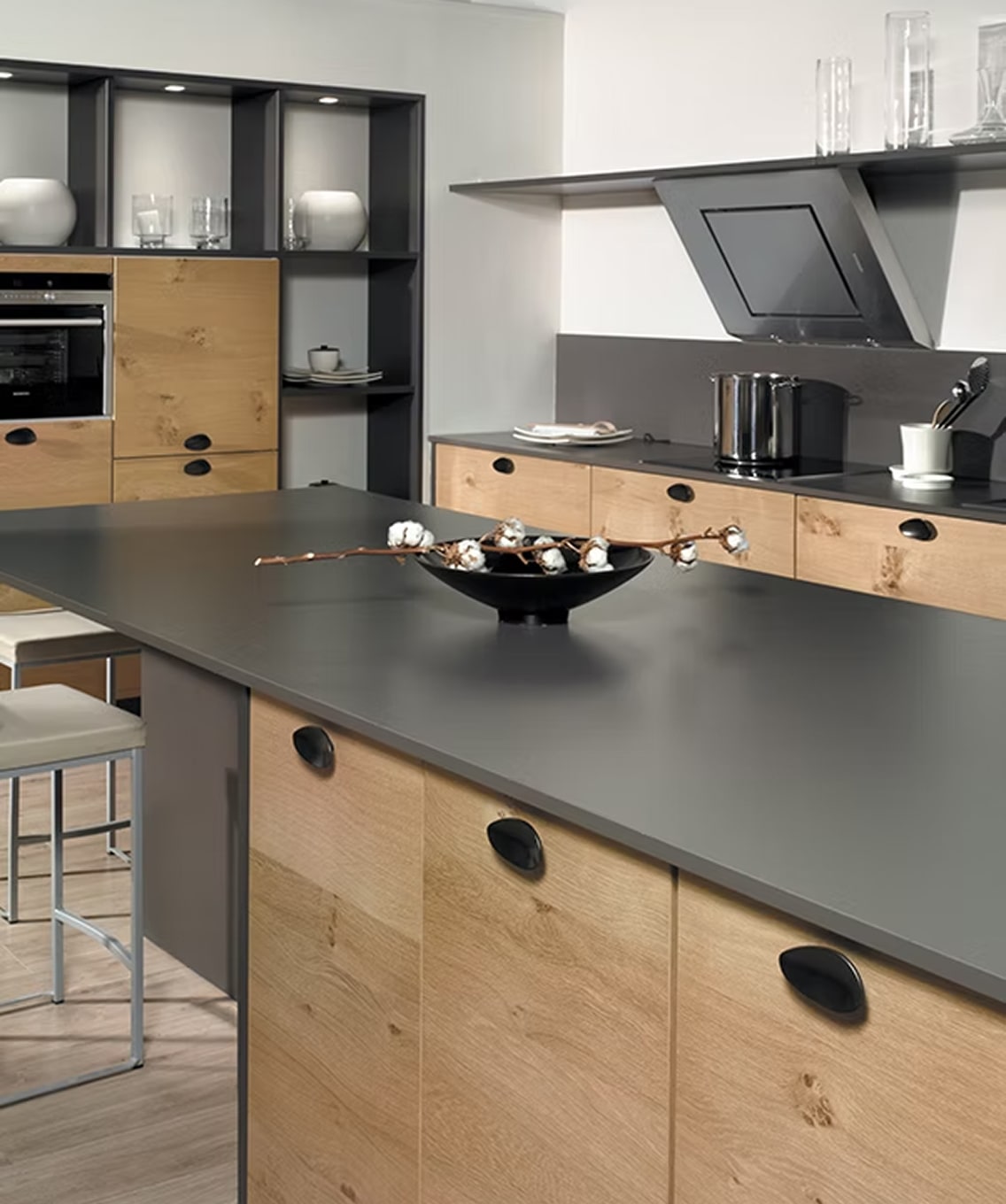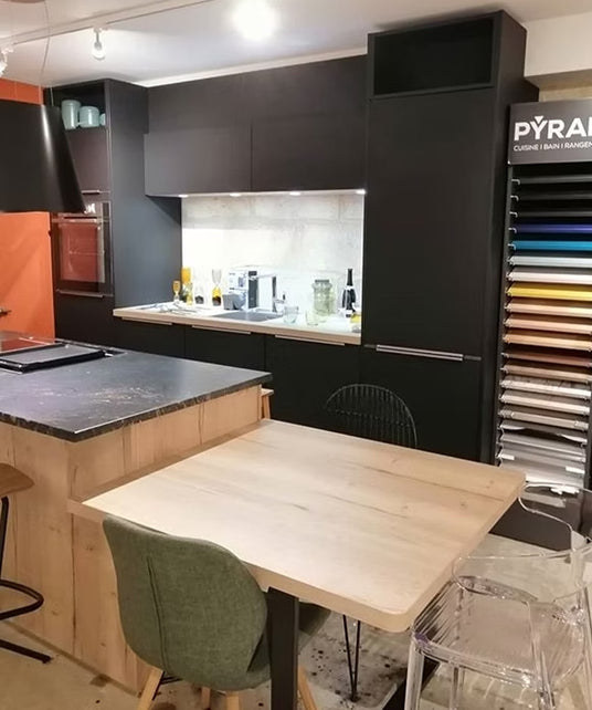 Fiers de notre indépendance, nous collaborons exclusivement avec deux PME françaises reconnues pour leur savoir-faire artisanal dans la fabrication de meubles de cuisine sur mesure. Un circuit court, pour une qualité sans compromis.