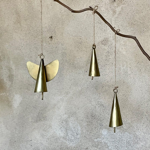 Petit ange en métal doré à suspendre. La clochette annonce le vent qui soufflera sur lui...