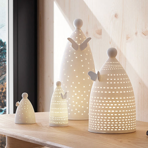 Magnifiques anges en porcelaine ajourée. La coupelle permet de glisser une bougie chauffe plat à l'intérieur. La transparence de la porcelaine permet à la lumière de passer