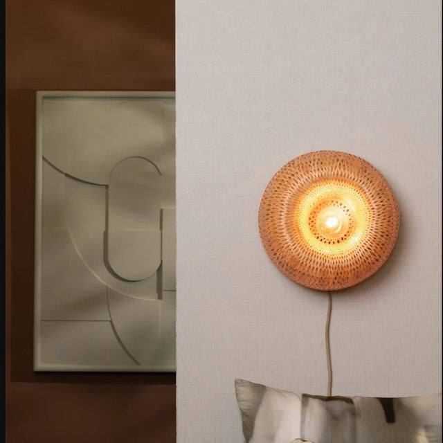 Applique murale en forme de "donut" tressé en bambou. Effet nature, lumière filtrée douce et pièce de déco. Particulièrement jolie avec nos ampoules qui rajoutent un élément décoratif supplémentaire.