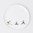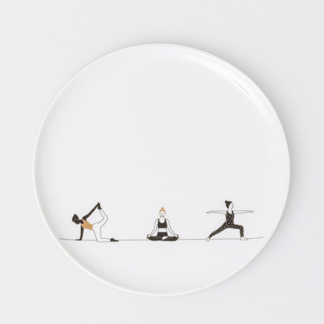 Petite assiette en porcelaine avec des motifs dorés et noirs de postures de yoga