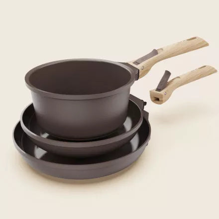 Plus d'excuses pour vous chère cuisinier ! Ce pack contient une casserole 20 cm, une poêle 24 cm, une poêle 28 cm ainsi que 2 poignées détachables et 2 feutrines de protection. Vous pourrez utiliser votre batterie de cuisine ultra compacte en toutes circonstances... Et être fier de l'amener à table (avec vos exploits culinaires)