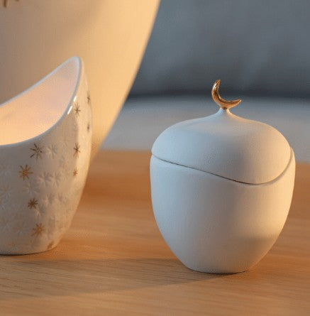 Jolie boite en porcelaine blanche. Son couvercle est orné d'un croissant de lune