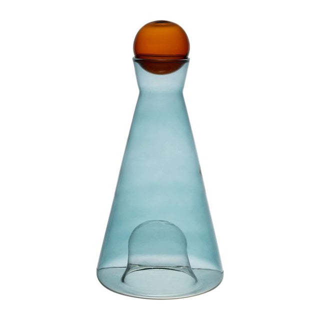 Carafe en verre couleur émeraude au design innovant. Son bouchon rond couleur ambre, également en verre, peut s'incruster sous la carafe pour faciliter son rangement pendant que l'on se sert...