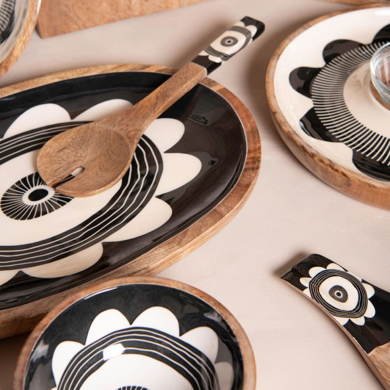 Cette collection célèbre le charme du bois de manguier, sublimé par des motifs graphiques noir et blanc.