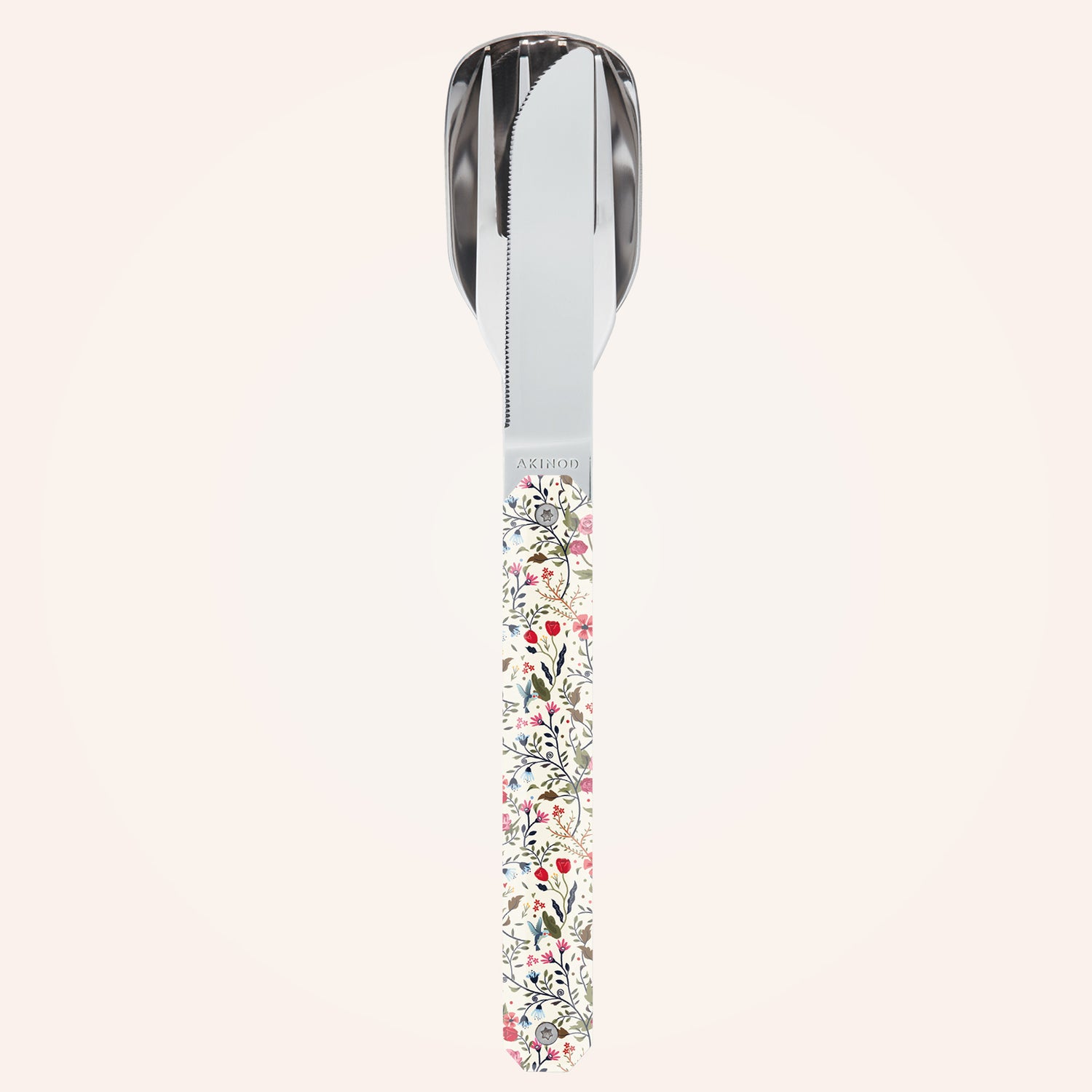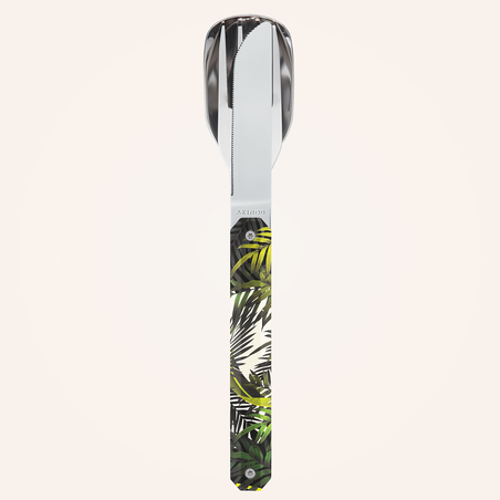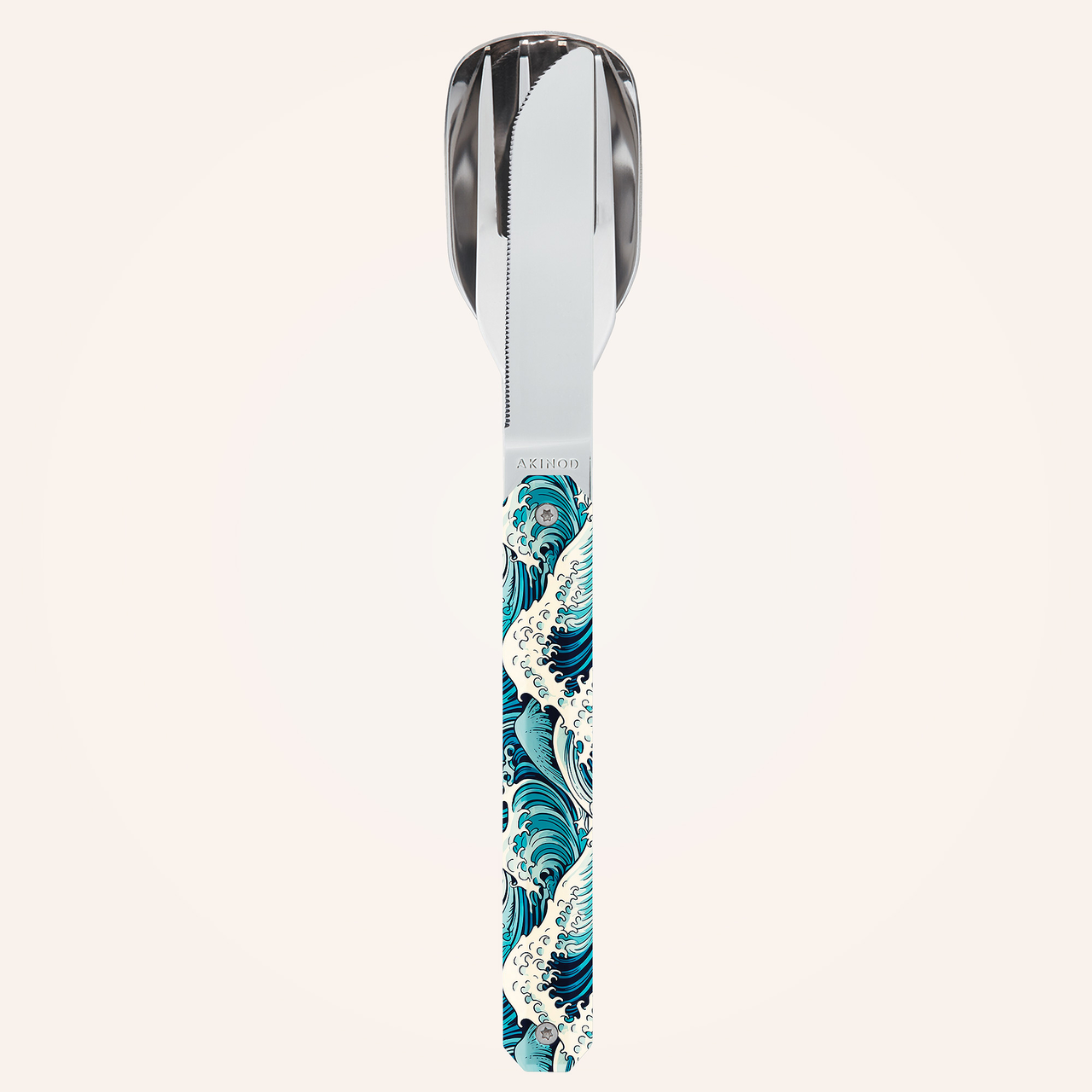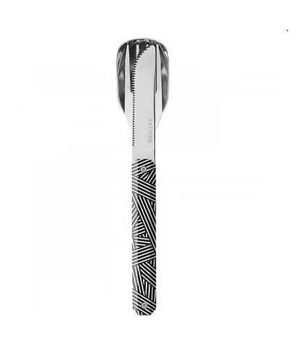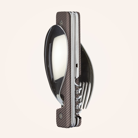 Couverts en acier inoxydable martensitique 2CR14, finition poli miroir. Composé d’une grande cuillère, d’une fourchette 4 dents et d’un couteau à lame micro dentée. Assemblage aimanté. Livré avec étui de transport rigide.