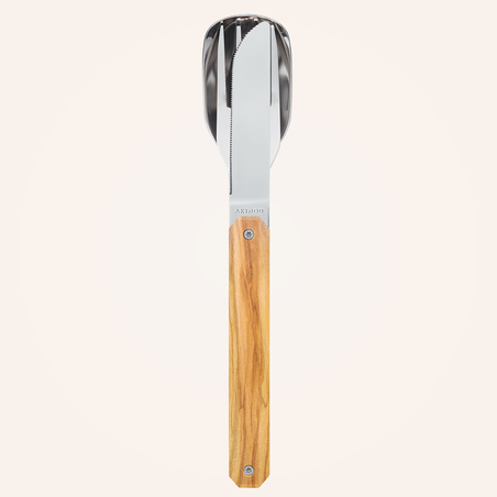 Composés d'une grande cuillère, d'un couteau et d'une fourchette qui s'aimantent entre eux. Couvert droit en acier inoxydable. Manche en bois d'olivier ou en résine