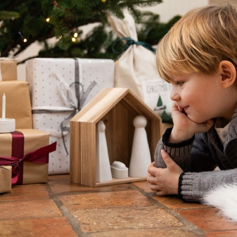 Magnifique de sobriété, de poésie et de modernité... Une belle crèche en bois les 3 personnages VIP en porcelaine mate.