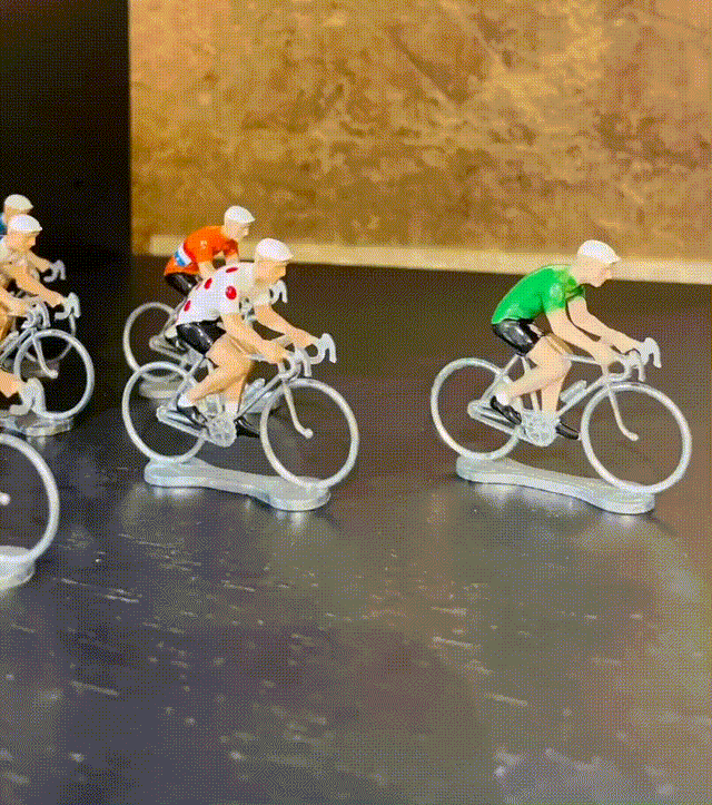 Chaque figurine peinte à la main représente un pays ou un maillot emblématique du Tour de France.