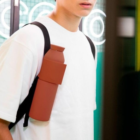 Cette gourde a été pensée pour simplifier nos déplacements au quotidien ,et ceci grâce à sa anse flexible en silicone qui vous permet de l'accrocher à différents supports comme votre vélo, poussette, scooter, valise...