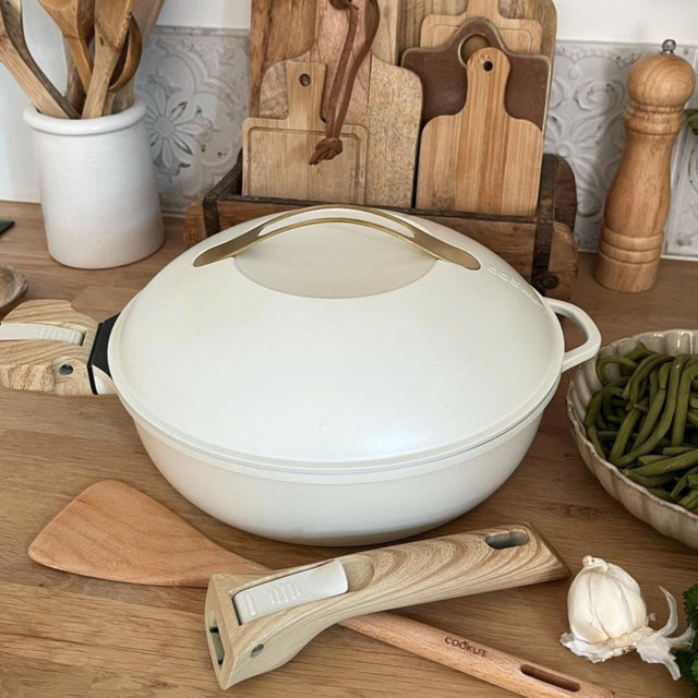 Inclus : 2 poignées détachables (une longue et une courte), un panier vapeur et une spatule en bois.