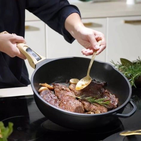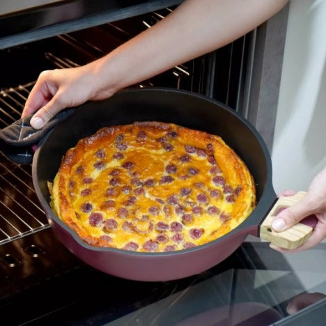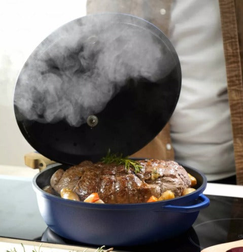Œufs au plat, poulets rôtis, légumes vapeur, blanquette de veau, frites, gratin, gâteaux, pizza... Tout est possible ! Totalement réalisée en métal recyclé, elle ne pèse que 1.8 kg. Son revêtement minéral ne contient aucun composé chimique, il est résistant et anti-adhérent donc ne nécessite aucune matière grasse!