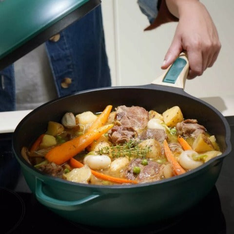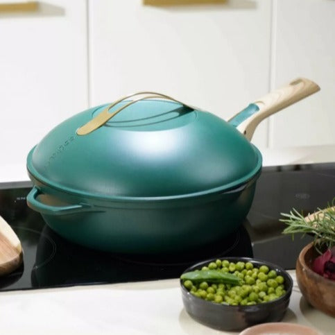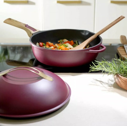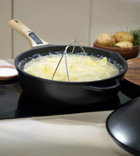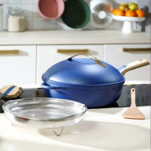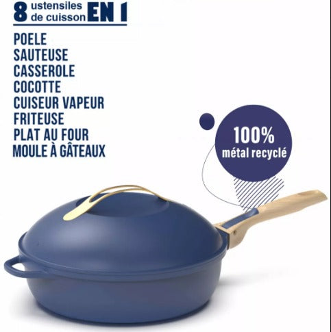 La fabuleuse est la poêle à tout faire qui remplace 8 ustensiles : poêle, sauteuse, casserole, cocotte, cuiseur vapeur, friteuse, plat au four, moule à gâteau ...