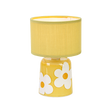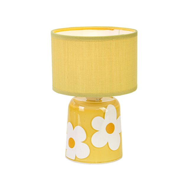 On aime cette petite lampe de table au look résolument retro : jolies fleurs sur son pied en verre et abat jour en tissu.