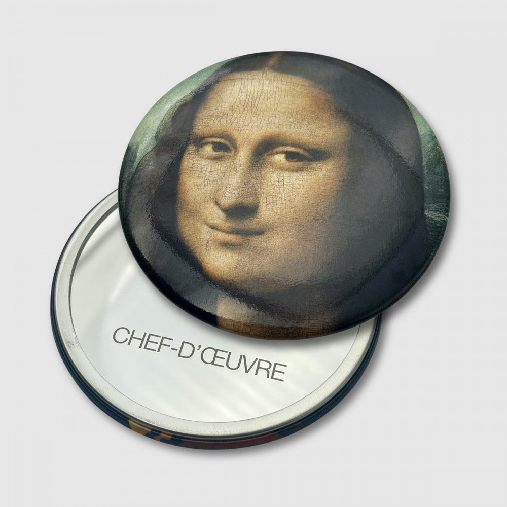 Une collection de miroirs de poche à l'effigie de la Joconde gravé de la mention : "CHEF D'OEUVRE"
