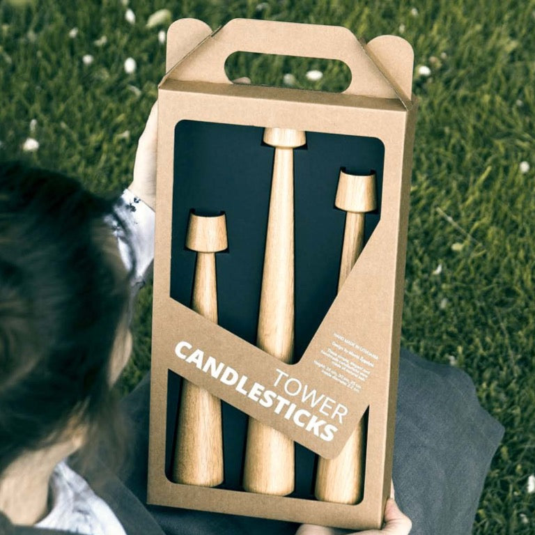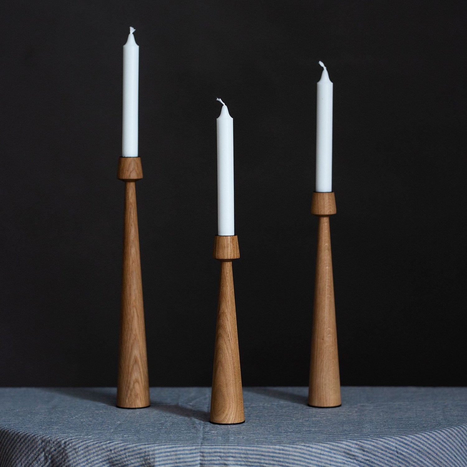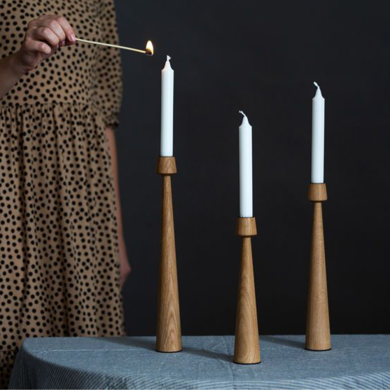 Coffret de 3 chandeliers en chêne naturel. Des lignes épurées et simples, pour un rendu très raffiné.. Conditionné dans son joli coffret.