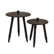 Découvrez notre ensemble de tables d’appoint. Les pieds sont composés d’un enchaînement de sphères sculptées dans du bois de manguier. Elles peuvent s’emboîter harmonieusement ou être placées séparément et grâce à la poignée intégrée, déplacées très facilement.