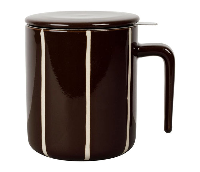 Tasse à thé en grès avec de belles rayures en contraste. On aime sa anse originale, son couvercle qui garde bien au chaud et son infuseur inox amovible très pratique...